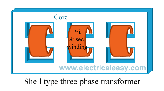 The shell-type transformer has a central limb surrounded by the primary and secondary windings of all three phases, resembling a shell enclosing the core. This configuration provides better magnetic shielding and reduces leakage flux, improving efficiency. However, the construction is more complex and expensive compared to the core-type, making it less common except for specialized high-power applications.